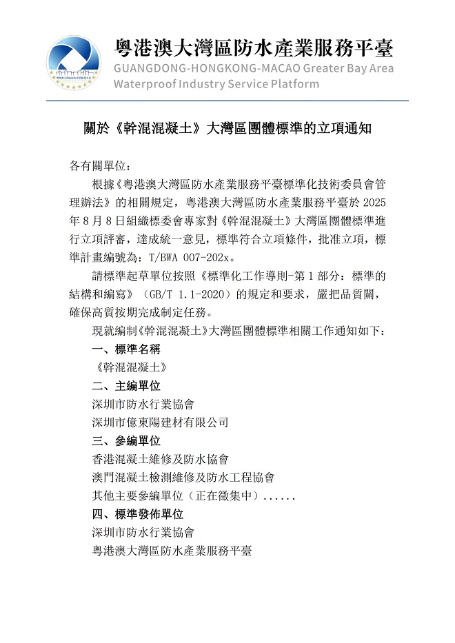 關於《幹混混凝土》大灣區團體標準的立項通知
