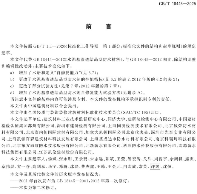 本文件代替GB18445-2012《水泥基渗透结晶型防水材料》,与GB18445-2012相比,除结构调整和编辑性改动外,主要技术变化如下: