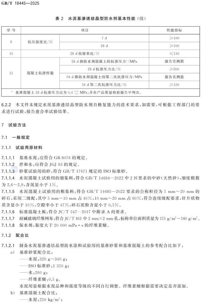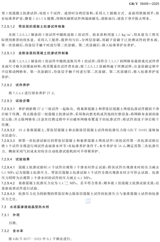 d)增加了水泥基渗透结品型防水剂自修复能力试验方法(见附录A)。