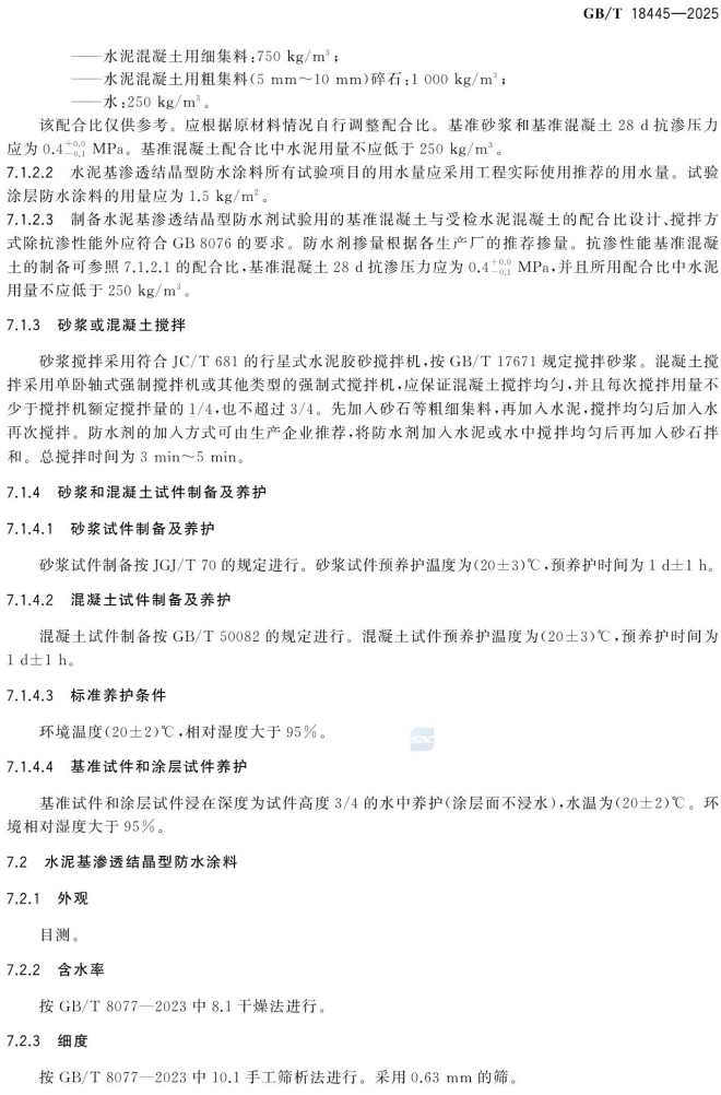 本文件规定了水泥基渗透结晶型防水材料的分类和标记、一般要求、技术要求、试验方法、检验规则以及标志、包装、贮存、运输和保质期。