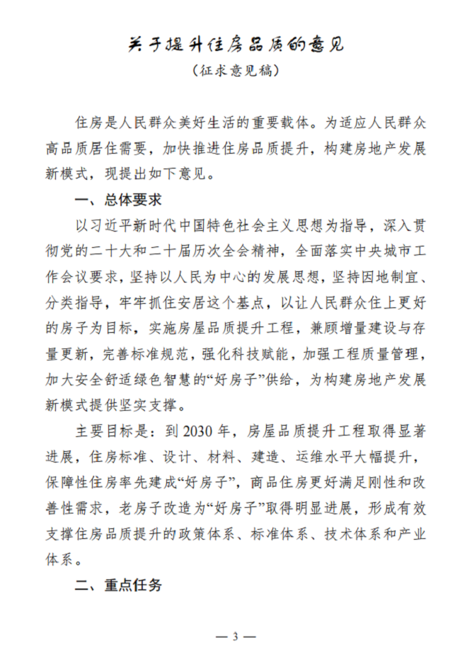 2025年12月24日,住房城乡建设部标准定额司发布了关于《关于提升住房品质的意见(征求意见稿)》公开征求意见的通知,全文如下:
