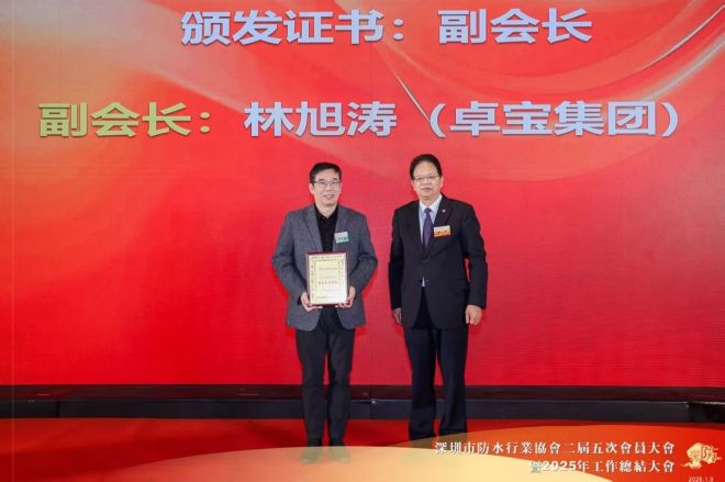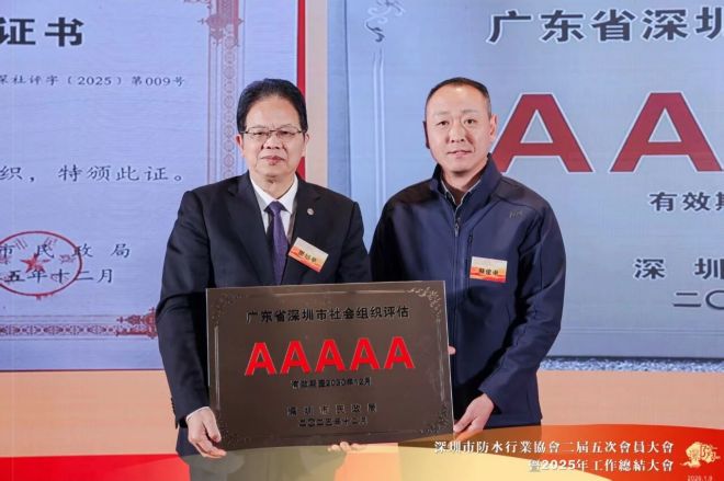 2025年,深圳市防水行业协会凭借卓越的综合表现与规范建设,荣获社会组织评估最高等级——5A评级。会上举行了市级社会组织等级评估证书颁发仪式,深圳市社会组织总会执行会长苏建东向深圳市防水行业协会会长瞿培华颁发了证书。