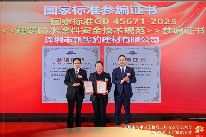 深圳市新黑豹建材有限公司王荣柱董事长获颁GB 45671—2025《建筑防水涂料安全技术规范》参编证书。