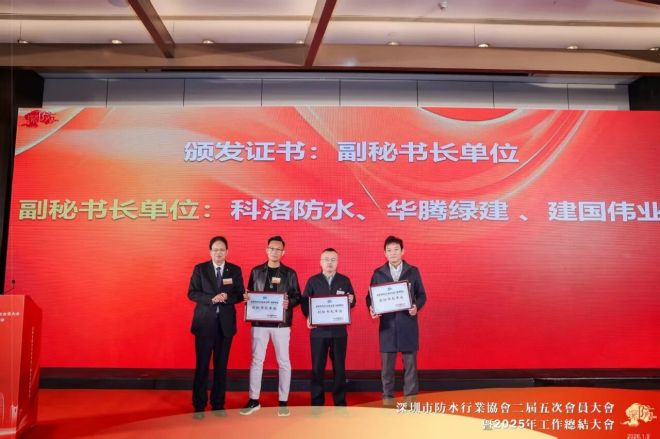 科洛自防水总经理杨飞、华腾绿建副总经理郭基智、建国伟业华南总经理熊树谦上台领取了新任副秘书长单位证书。