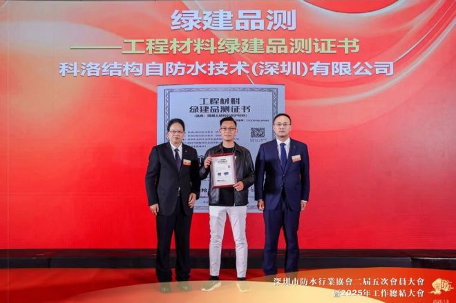 科洛结构自防水技术(深圳)有限公司杨飞总经理获颁“工程材料绿建品测证书”。